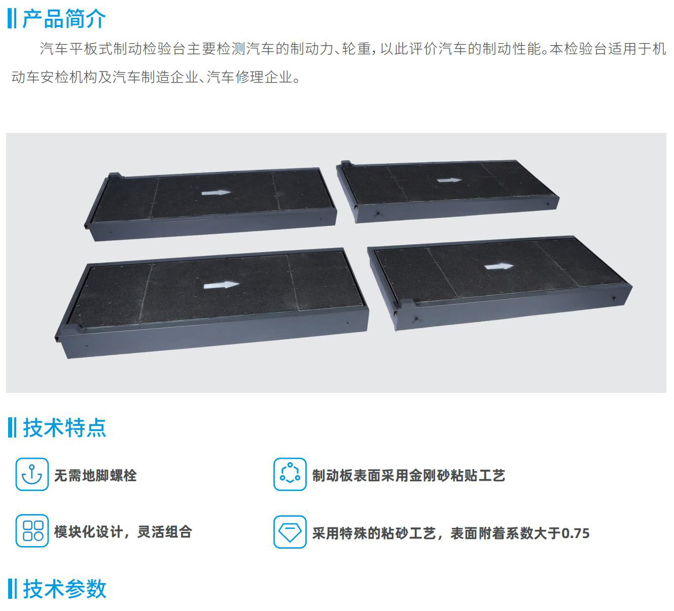 汽車(chē)平板式制動(dòng)檢驗(yàn)臺(tái)主要檢測(cè)汽車(chē)的制動(dòng)力、輪重,以此評(píng)價(jià)汽車(chē)的制動(dòng)性能。本檢驗(yàn)臺(tái)適用于機(jī)動(dòng)車(chē)安檢機(jī)構(gòu)及汽車(chē)制造企業(yè)、汽車(chē)修理企業(yè)。